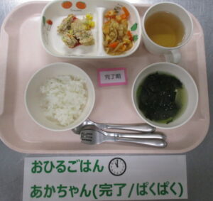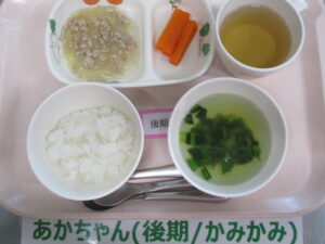 【後期食】五倍粥、豚ひき肉と玉ねぎの煮物、人参スティック、ほうれん草の味噌汁
