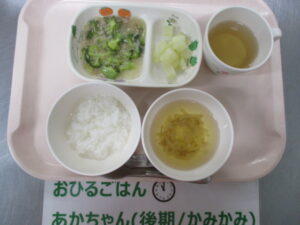 【後期食】五倍粥、ツナとブロッコリーの煮物、蒸しじゃが芋、もやしのスープ