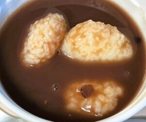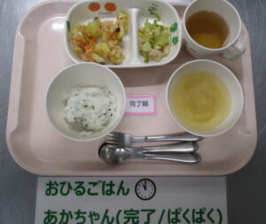 ※日本の行事と食文化を大切にするため「かがみびらきにお餅の入ったおしるこを食べること」は伝えますが、飲み込みには不安あり。そのため、お餅のかわりとして、給食さんが炊いた白米の粒が半分残る程度に潰し(いわゆる「半ごろし」です)丸めたものを提供してくれています。