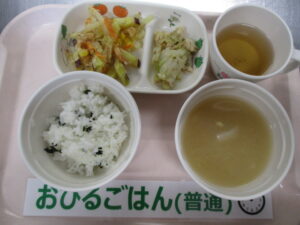 わかめご飯、さつま芋のかき揚げ、ささ身とキャベツのごま和え、高野豆腐と大根の味噌汁