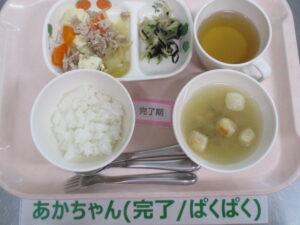 【完了食】軟飯、肉豆腐、磯香和え、麩としめじの味噌汁