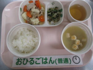 【後期食】五倍粥、ささ身と人参の煮物、ふかし芋、大根の味噌汁