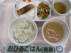 麦ごはん、鮭の照り焼き、切干大根の煮物、かまぼこと油揚げの味噌汁