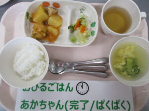 【完了食】軟飯、イズミル風ハンバーグ、チーズ入りキャベツサラダ、ブロッコリーと卵のスープ