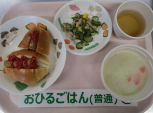 〈メニュー〉ホットドッグ、カニカマときゅうりのサラダ、冬野菜の豆乳クリームシチュー