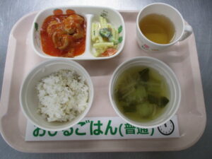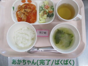 ★2/16(金)★今日の給食・おやつ 2024/02/16 ★幼児★ 〈メニュー〉 麦ごはん、鶏肉のトマト煮、マカロニサラダ、チンゲン菜ともやしの味噌汁 ———————————————————- ★離乳食★ 〈メニュー〉 【完了食】軟飯、鶏肉のトマト煮、マカロニサラダ、チンゲン菜ともやしの味噌汁 ===================================== 【おやつ】 〈メニュー〉 【完了期食以降】牛乳、さつま芋のちんすこう