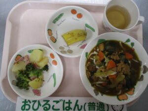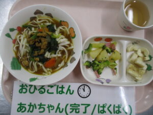 〈メニュー〉カレーうどん、ブロッコリーとじゃがいものサラダ、バナナ