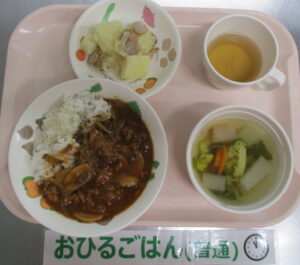 ハヤシライス、ジャーマンポテト、野菜スープ、ゼリー