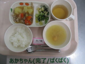 〈メニュー〉ご飯、肉じゃが、白菜と小松菜のおかか和え、厚揚げとえのきの味噌汁