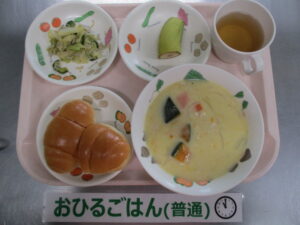 ★3/7(木)★今日の給食・おやつ 2024/03/07 ★幼児★ 〈メニュー〉 ロールパン、かぼちゃとコーンのクリームシチュー、しらすと白菜のサラダ、バナナ ———————————————————- ★離乳食★ 〈メニュー〉 【完了食】ロールパン、かぼちゃとコーンのクリームシチュー、しらすと白菜のサラダ、バナナ ===================================== 【おやつ】 〈メニュー〉 【完了期食以降】麦茶、ひじきご飯