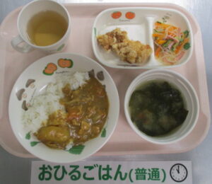 カレーライス、鶏のから揚げ、春雨サラダ、わかめとなめこの味噌汁、ゼリー