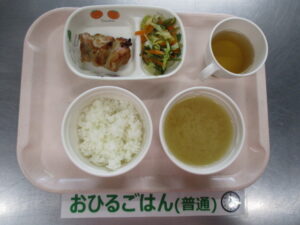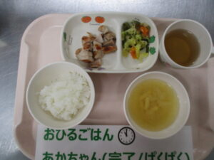 ★3/19(火)★今日の給食・おやつ 2024/03/19 ★幼児★ 〈メニュー〉 ご飯、鶏肉の照り焼き、茎わかめのサラダ、高野豆腐と玉ねぎの味噌汁 ———————————————————- ★離乳食★ 〈メニュー〉 【完了食】軟飯、鶏肉の照り焼き、茎わかめのサラダ、高野豆腐と玉ねぎの味噌汁 ===================================== 【おやつ】 〈メニュー〉 【完了期食以降】しらす入りゆかりご飯