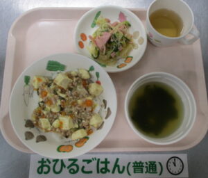 麻婆丼、バンサンスー、わかめとコーンのスープ