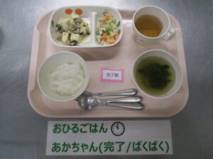 【中期食】お粥、ささ身と野菜の煮物、茹で野菜、豆腐と野菜のスープ