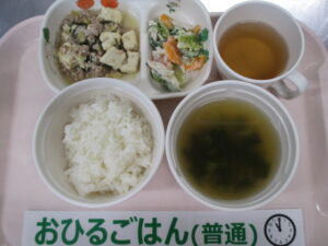 ご飯、潮麻婆豆腐、チキンサラダ、小松菜としめじのスープ