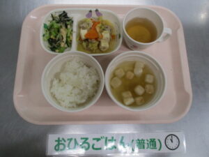 【中期食】お粥、豆腐と野菜の味噌煮,茹で野菜、麩と玉ねぎのすまし汁