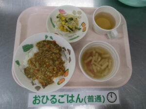 大豆ミート入りキーマカレーライス、切干大根のサラダ、高野豆腐とかまぼこのスープ