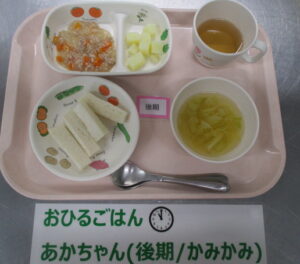 【中期食】パン粥、ツナと野菜の煮物、茹で野菜、野菜のスープ