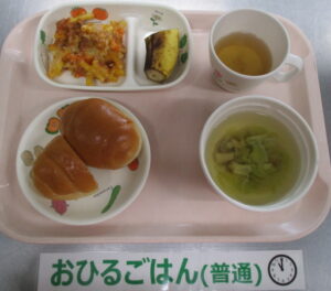 【完了期食】ロールパン、マカロニミートグラタン、キャベツとしめじのスープ、バナナ