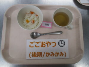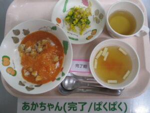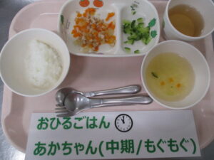 【中期食】お粥、鶏肉と野菜の煮物、茹で野菜、野菜のスープ