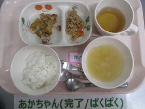 【完了期食】軟飯、鶏肉のカレー照り焼き、納豆和え、竹輪と大根の味噌汁