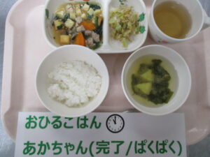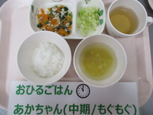 【中期食】お粥、鶏肉と野菜の煮物、茹で野菜、野菜の味噌汁