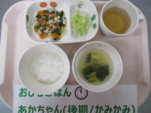 【後期食】お粥、鶏肉と野菜の煮物、茹で野菜、わかめと野菜のの味噌汁