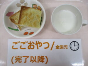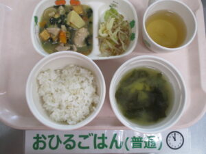 麦ごはん、治部煮風、キャベツともやしのおかか和え、わかめとさつま芋の味噌汁