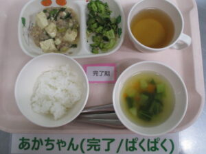 【完了期食】軟飯、麻婆豆腐、ブロッコリーとカニカマのサラダ、チンゲン菜と人参の中華スープ
