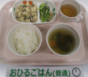 ご飯、麻婆豆腐、ブロッコリーとカニカマのサラダ、チンゲン菜と人参の中華スープ