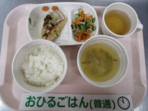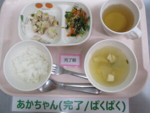 【完了期食】軟飯、鮭のねぎ塩焼き、ナムル、大根と油揚げの味噌汁