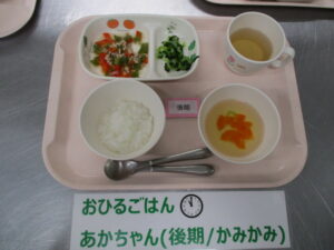 【後期食】お粥、豚肉と野菜の煮物、茹で野菜、人参のすまし汁