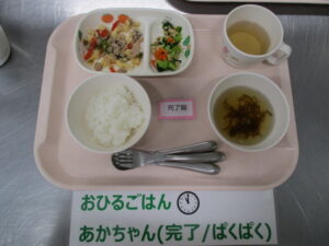 【完了期食】軟飯、豚肉とたけのこの炒め物、小松菜の納豆和え、もずくのすまし汁