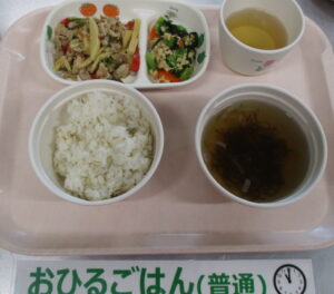 麦ごはん、豚肉とたけのこの炒め物、小松菜の納豆和え、もずくのすまし汁