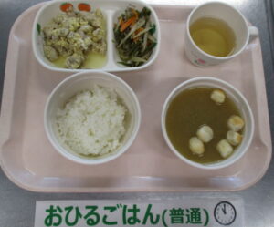 【完了期食】軟飯、豚玉煮、茎わかめのきんぴら、なめこと麩の味噌汁
