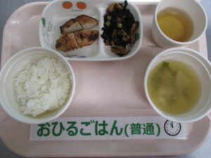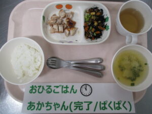 【完了期食】軟飯、バーべキューチキン、ひじきの含め煮、かぶの味噌汁