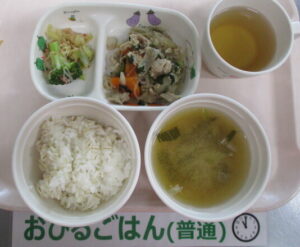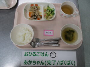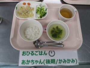 【後期食】お粥、豚肉と野菜の煮物、茹で野菜、野菜の味噌汁