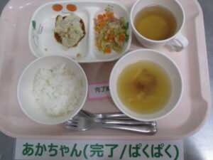 【完了期食】軟飯、スコップコロッケ、キャベツとツナのサラダ、なめこと高野豆腐の味噌汁