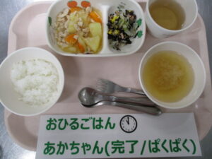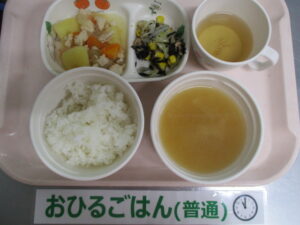 【完了期食】軟飯、鶏肉じゃが、ひじきサラダ、大根とえのきの味噌汁