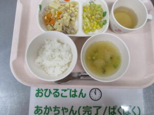 【完了期食】軟飯、豚肉と高野豆腐のかきたま煮、キャベツとコーンのごま和え、大根の味噌汁