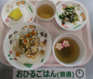 〈メニュー〉具だくさんそぼろ丼、磯香和え、麩とオクラのすまし汁、バナナ