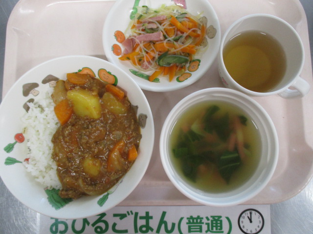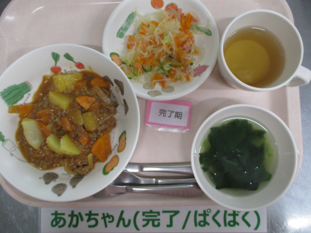 ★7/30(水)今日の給食・おやつ★ 2025/07/29 ★本日のメニュー★ ◆◆◆給 食◆◆◆ ひき肉とトマトのカレーライス 春雨サラダ かまぼことチンゲン菜のスープ ————————————— ◇◇◇おやつ◇◇◇ 牛乳 豆乳ココアプリン ================================ ★離乳食のメニュー★ (※完了期食・・軟飯+幼児メニューに同じ) ◆◆◆給 食◆◆◆ <中期食> ※提供なし ◇◇◇おやつ◇◇◇ ※提供なし