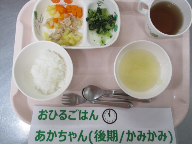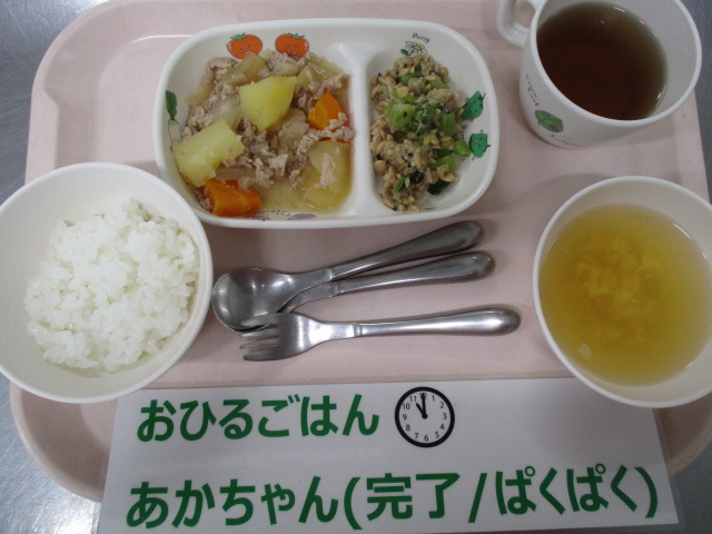 ★9/16(火)今日の給食・おやつ★ 2025/09/16 ◆◆◆給 食◆◆◆ 麦ご飯 肉じゃが 小松菜の納豆和え かきたま味噌汁 ————————————— ◇◇◇おやつ◇◇◇ 牛乳 クラッカーサンド ================================ ★離乳食のメニュー★ (※完了期食・・軟飯+幼児メニューに同じ) ◆◆◆給 食◆◆◆ <後期食> お粥 肉じゃが 茹で野菜 玉ねぎの味噌汁 ◇◇◇おやつ◇◇◇ 麦茶 野菜粥