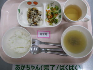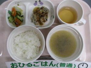 ★2/4(金)★今日の給食・おやつ 2022/02/04 【 給 食 】 ★幼児★ <メニュー> ご飯、おからハンバーグ、磯香和え、なめこの味噌汁 ———————————– ★離乳食★ <メニュー> 軟飯、おからハンバーグ、磯香和え、なめこの味噌汁 ===================================== 【 おやつ 】 <メニュー> じゃがいものクッキー、牛乳
