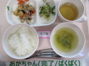 軟飯、豚肉と厚揚げの中華炒め、もやしときゅうりのナムル、チンゲン菜とえのきのスープ