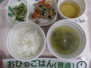 麦ご飯、豚肉と厚揚げの中華炒め、もやしときゅうりのナムル、チンゲン菜とえのきのスープ