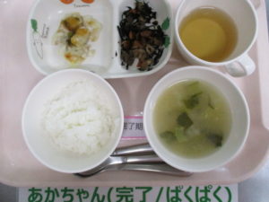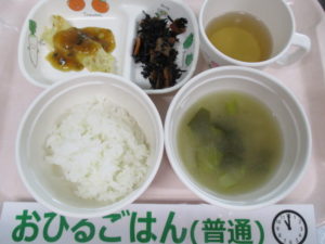 軟飯、白身魚のみぞれあんかけ、ひじきの含め煮、小松菜と白菜の味噌汁