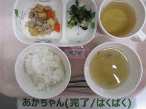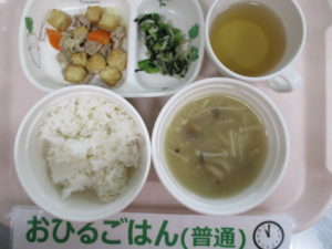 麦ご飯、厚揚げの野菜あんかけ炒め、磯香和え、きのこの味噌汁