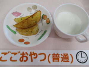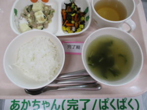 ★3/16(水)★今日の給食・おやつ 2022/03/16 【 給 食 】 ★幼児★ <メニュー>ご飯、麻婆豆腐、ひじくサラダ、わかめとえのきのスープ ———————————– ★離乳食★ <メニュー> 軟飯、 麻婆豆腐、ひじきサラダ、わかめとえのきのスープ ===================================== 【 おやつ 】 <メニュー>牛乳、フライドポテト