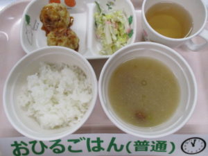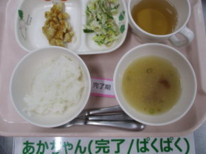 ★3/18(金)★今日の給食・おやつ 2022/03/18 【 給 食 】 ★幼 児★ <メニュー> ご飯、つくね焼き、もやしのサラダ(カレー風味)、なめこの味噌汁 —————— ★離乳食★ <メニュー> 軟飯、つくね焼き、もやしのサラダ(カレー風味)、なめこの味噌汁 ===================================== 【 おやつ 】 <メニュー> 牛乳、小松菜のクッキー